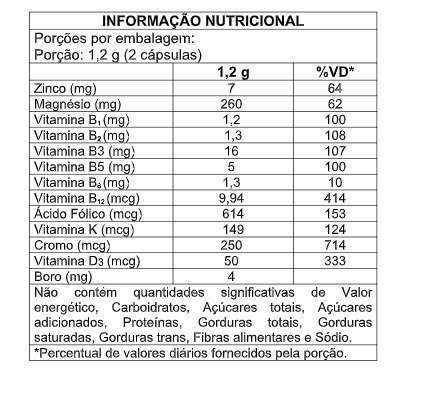 Óxido de magnésio, bisglicinato de zinco, cloridrato de tiamina (vitamina B1), riboflavina (vitamina B2), nicotinamida (vitamina B3), D-pantotenato de cálcio (vitamina B5), piridoxina (vitamina B6), tetraborato de sódio decahidratado, cianocobalamina (vitamina B12), colecalciferol (vitamina D3), fitomenadiona (vitamina K), picolinato de cromo, ácido fólico, estabilizantes celulose microcristalina e amido, antiumectante dióxido de silício. Ingredientes da cápsula: Gelatina, corante inorgânico vermelho 40, opacificante dióxido de titânio e água potável filtrada. NÃO CONTÉM GLÚTEN.